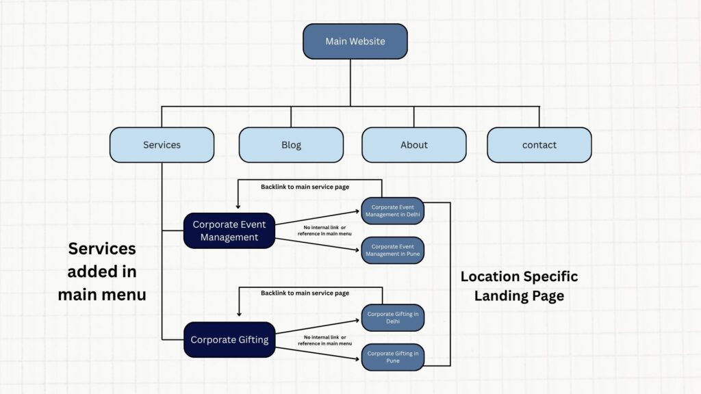 For example, businesses offering multiple services across different cities often want to attract clients searching for location-specific terms like “event management company in Delhi” or “corporate gifting company in Bangalore”, a single service page is usually not enough to rank for all these local searches but adding every city name to your main menu (Delhi, Bangalore, Gurgaon, etc.) only makes the site cluttered and confusing.